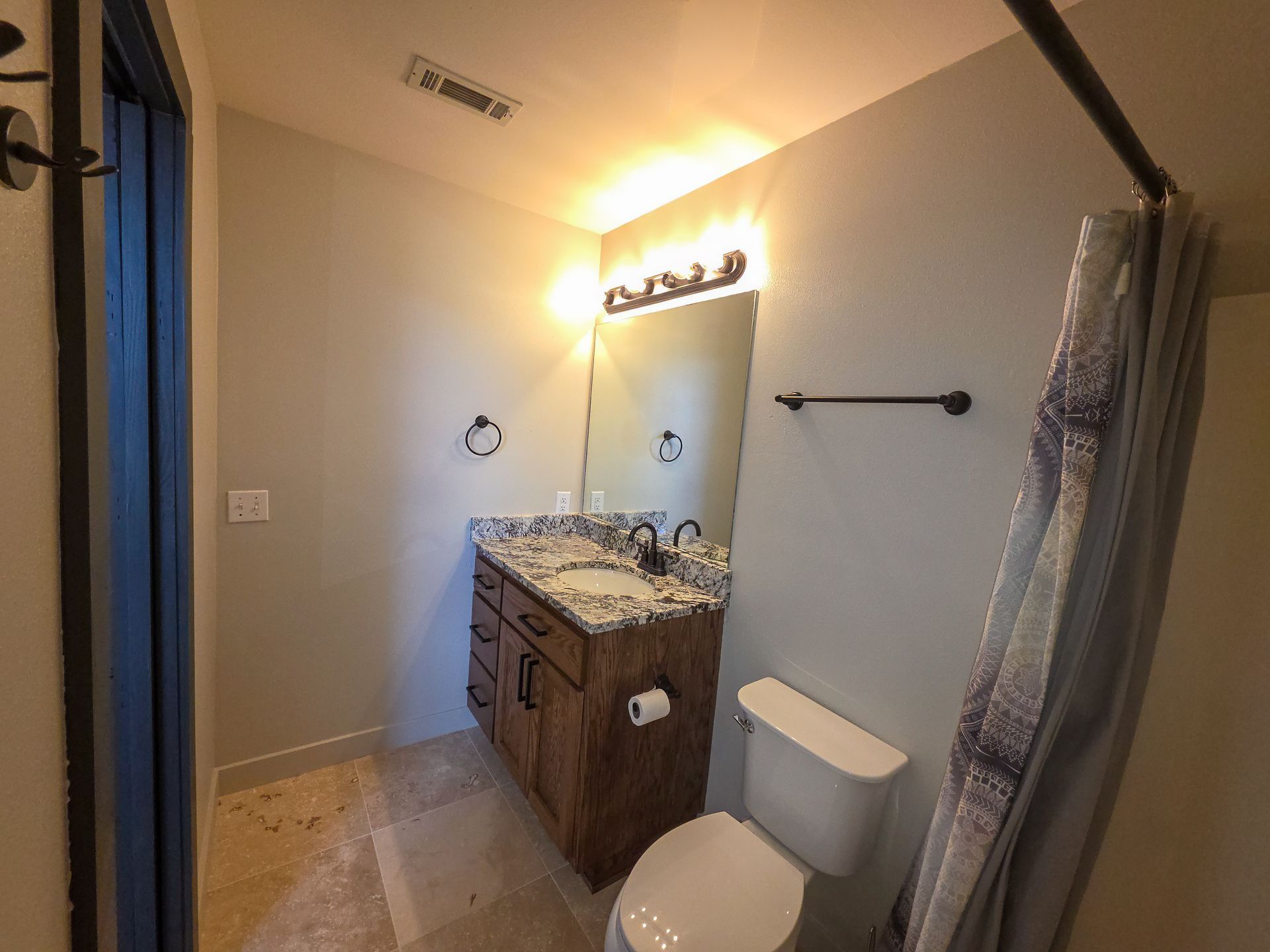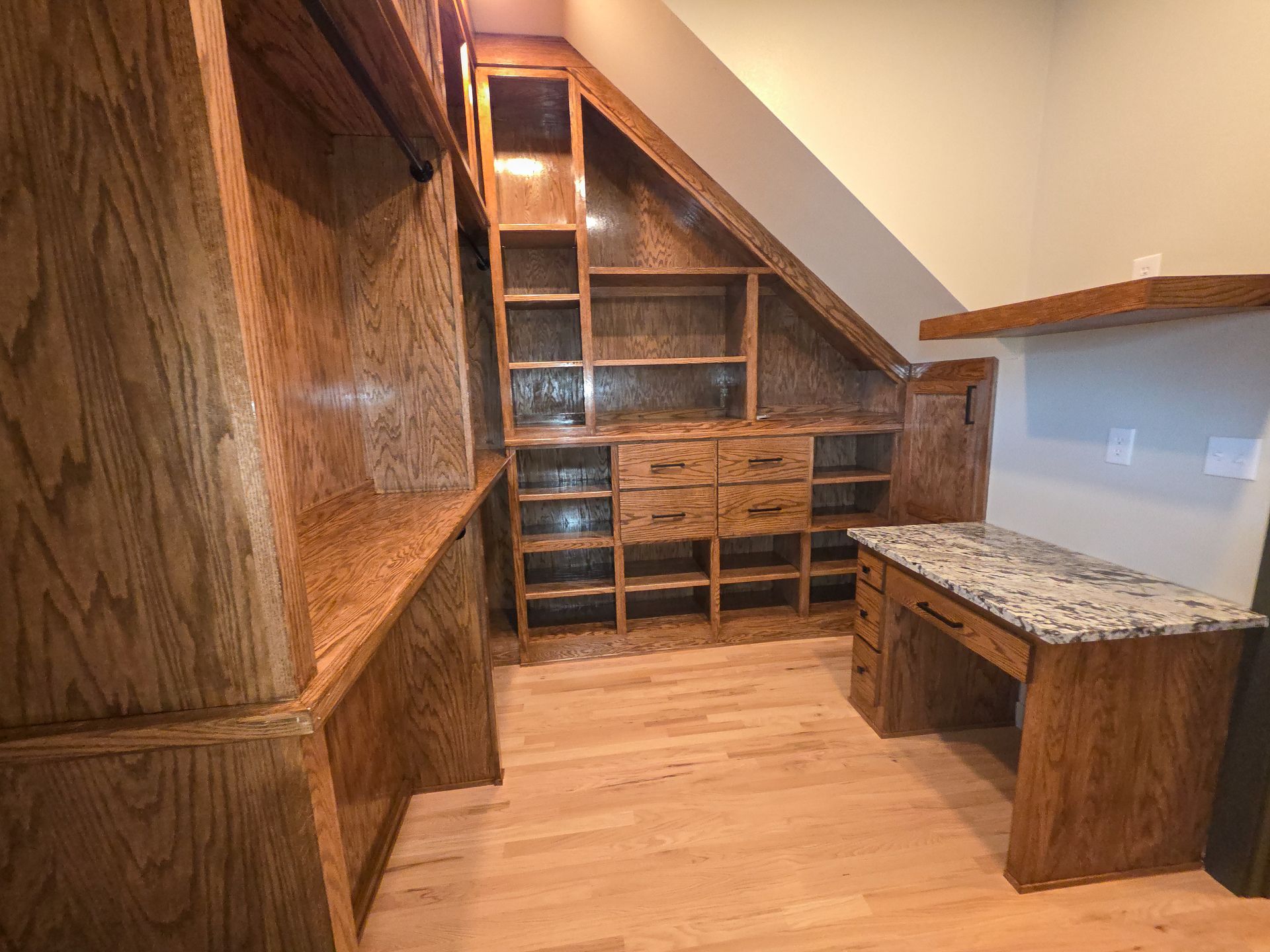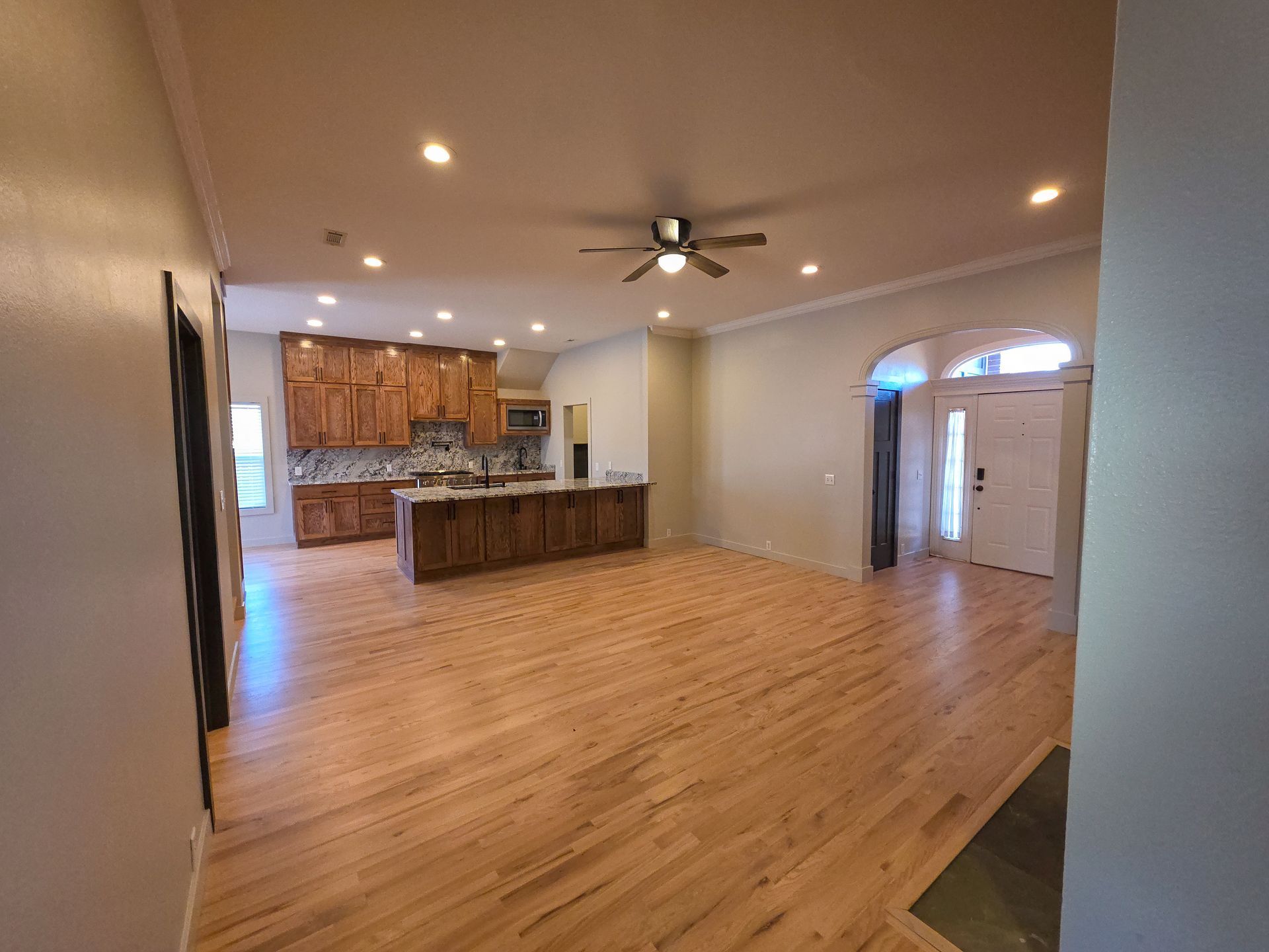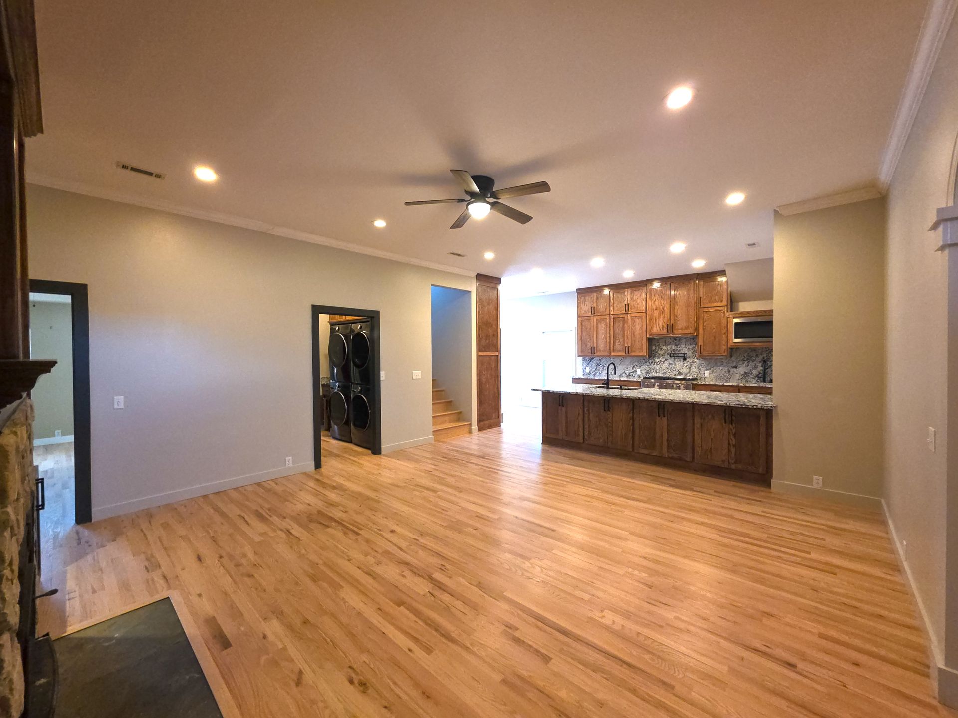The kitchen shines with granite countertops and a matching granite backsplash, and the same granite continues throughout the home. Enjoy natural hardwood flooring through most of the house (solid red oak, natural blonde finish), plus new carpet in the two front bedrooms.
