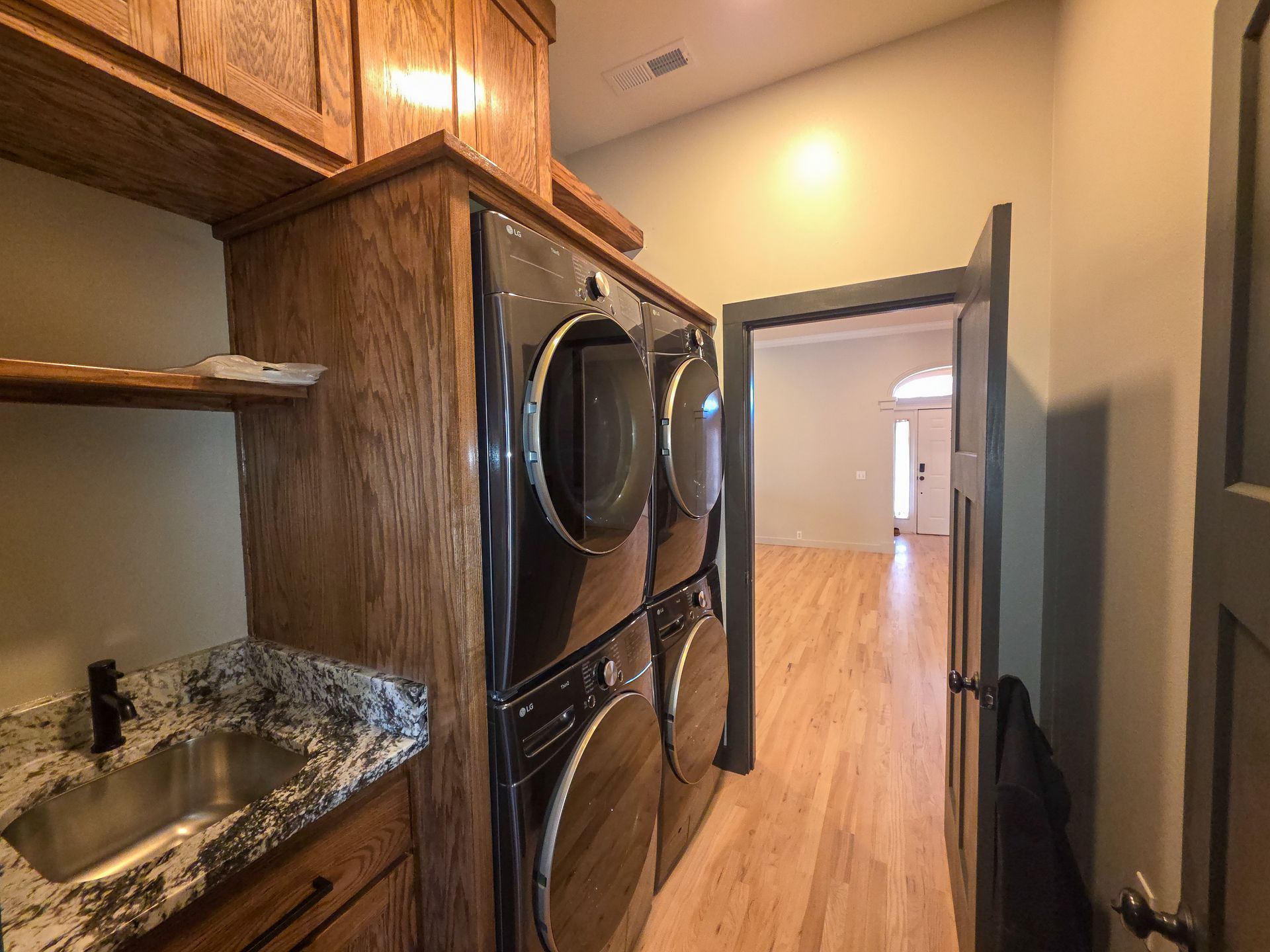Upgraded laundry room with utility sink and two brand-new LG TurboWash 360 stackable washer/dryer sets.
