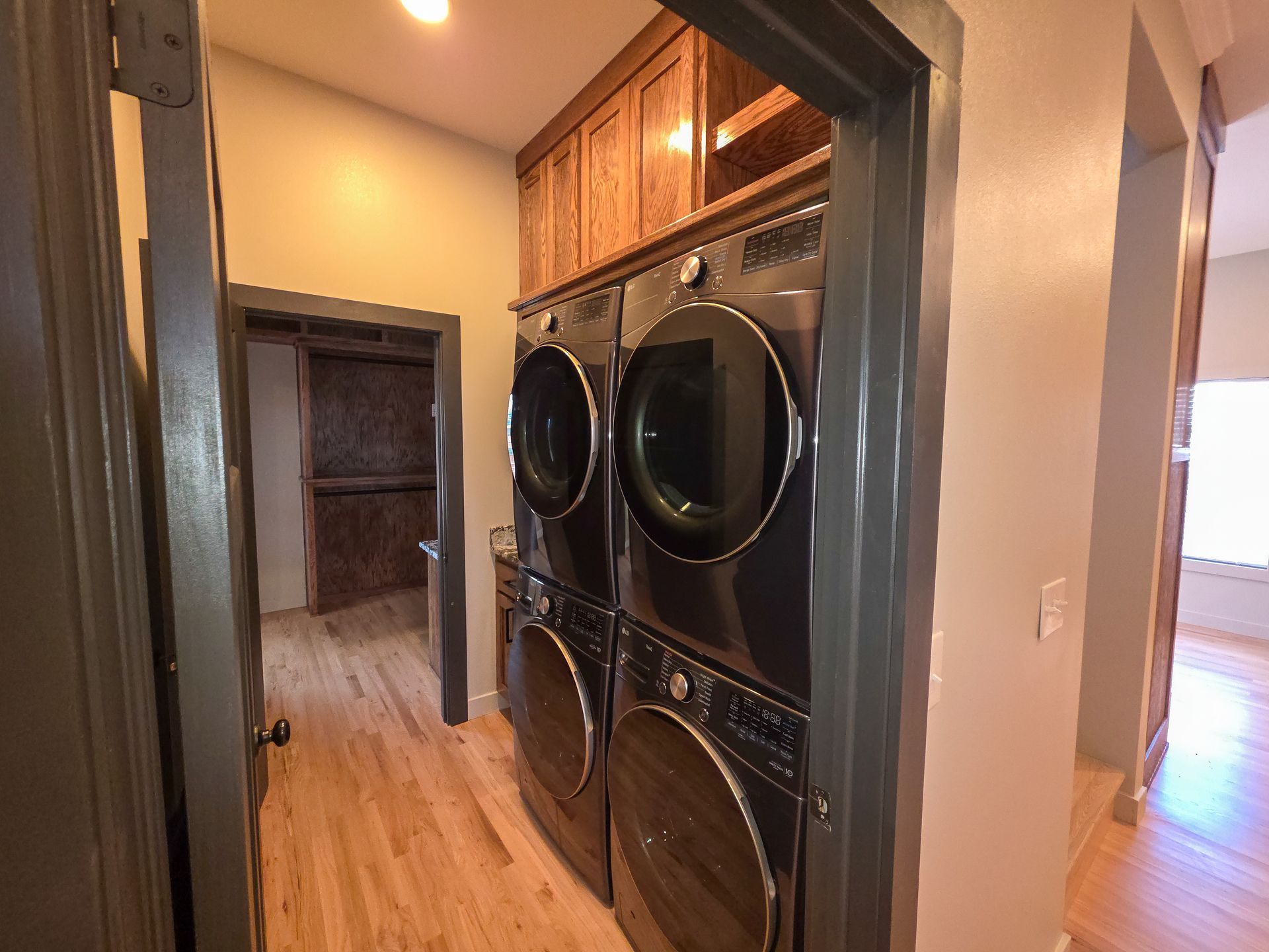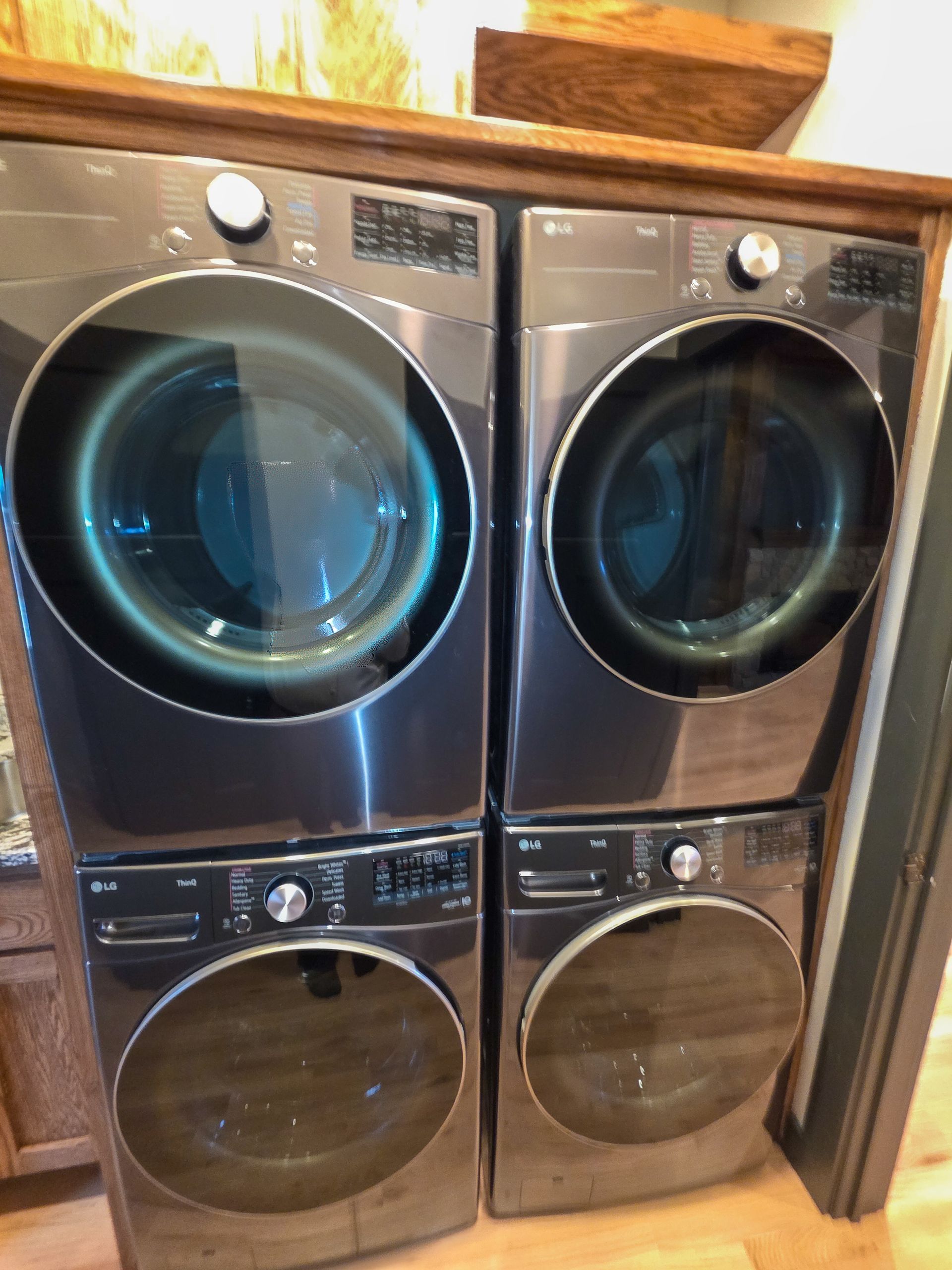 With dual stacked sets, this laundry room is ideal for larger households, busy schedules, or anyone who wants to cut laundry time dramatically while keeping everything neatly tucked into a dedicated, upgraded space.